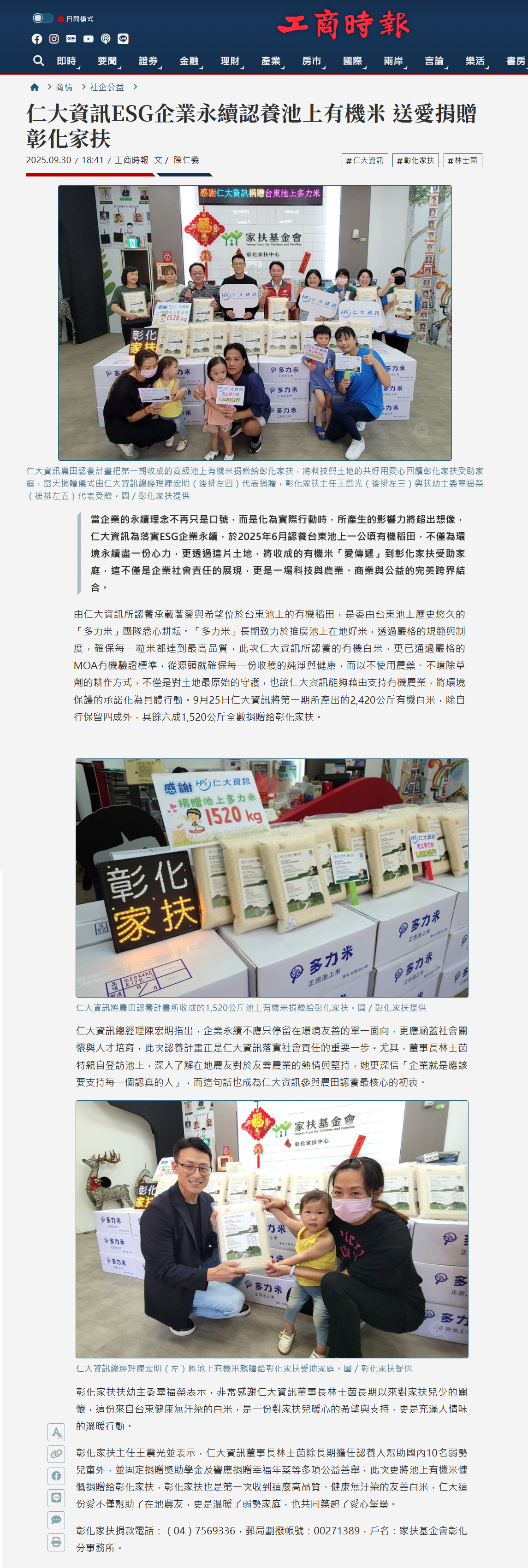 仁大資訊ESG企業永續認養池上有機米 送愛捐贈彰化家扶