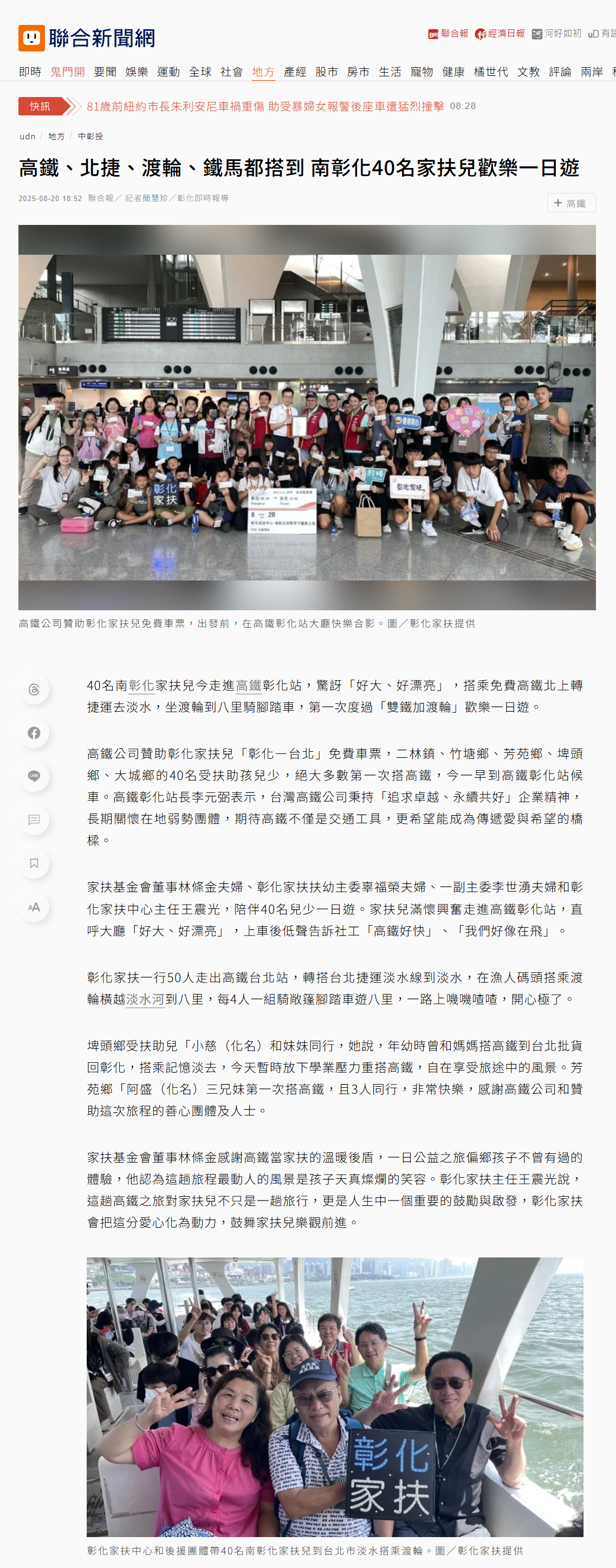 高鐵、北捷、渡輪、鐵馬都搭到 南彰化40名家扶兒歡樂一日遊