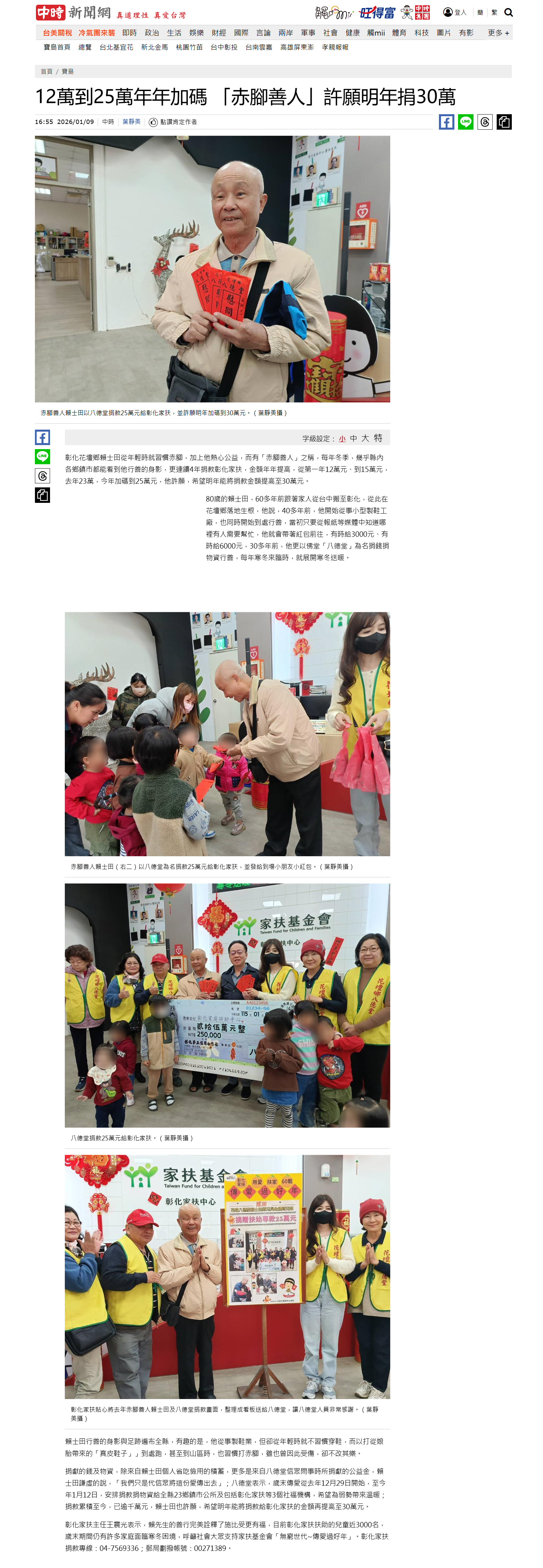 12萬到25萬年年加碼 「赤腳善人」許願明年捐30萬