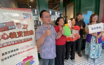 彰化家扶中心扶助的施雅萍姊妹(左二、三)經營事業有成,舉辦義賣都捐給彰化家扶作為獎助學金。記者簡慧珍/攝影