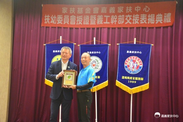 嘉義家扶自民國70年起成立「展愛服務隊」、「家扶之友會」及「溫媽媽愛家服務隊」三支義工隊。義工們來自各行各業,利用週末假日時間協助推動扶幼工作。除了奉獻心力的義工外,另有一群由在地企業家與經理人組成的扶幼委員會,更是家扶中心重要的強力後盾。連任主任委員的黃國芳董事長,長期出錢出力,以實際行動關懷兒少成長。典禮中最受矚目的亮點,是家扶之友會的蘇振宏。他自民國74年加入至今已屆滿40年,是該中心志工年資排名前三的資深伙伴。蘇振宏在服務期間以熱情的服務、溫暖的態度來陪伴兒少成長,也分享自身成長經歷來鼓勵仍處於逆境的孩子們,正是「以生命影響生命」的最佳代表。蘇振宏在服務期間不僅獲得許多正向回饋,學習到知足與感恩,更結識了終生伴侶,共組家庭,透過身教示範,攜手帶領子女一同參與服務行列,讓助人的精神在家庭中扎根,造福他人也造福自己,以善的力量滾動善的循環,展現生命中最美麗的風景。