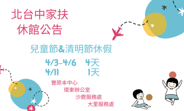 家扶配合國定假日 115年 𝟰 月 𝟯 日 (五) ~ 𝟰 月 𝟲 日(一) 休館4天 115年4 月11日(六)...