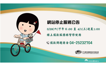 📣為了提供更好的服務品質,將於👉3/28(六)下午18:00至4/1(三)凌晨1:00進行系統維護,線上捐款服務於此期間將暫停使用,造成不便,敬請見諒!
