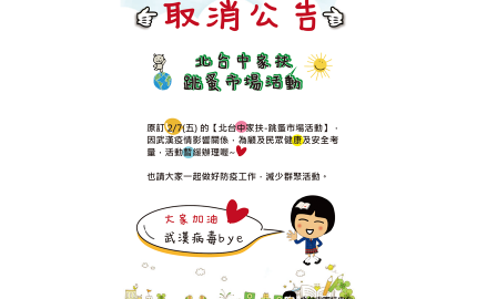 #活動延期公告 📣原訂2/7(五) 的👉【北台中家扶-跳蚤市場活動】,因武漢疫情影響關係,為顧及民眾健康及安全考量,活動將再擇期舉辦❗