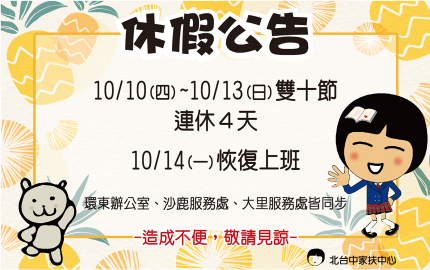 🎵 2019/10/10(四)~ 2019/10/13(日)➰國定假日-雙十節,家扶連休 4 天~😉
