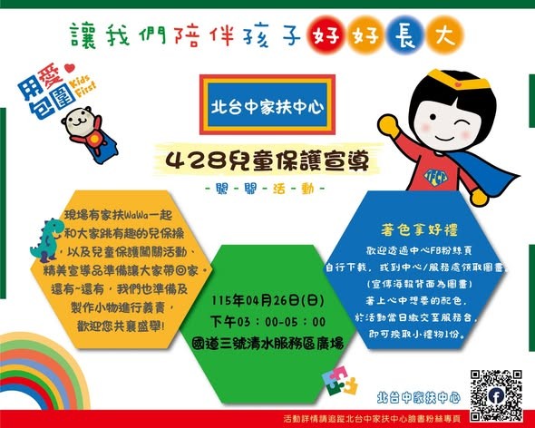 在活動開始前,我們也想邀請大家一同參與暖身活動:可在中心FB粉絲專頁下載,或親至中心/服務處領取宣傳海報(預計4月份發送至鄰近國小與幼兒園)。海報背面為著色圖案,歡迎孩子們自由發揮創意上色,並於活動當日繳交至服務台,即可兌換