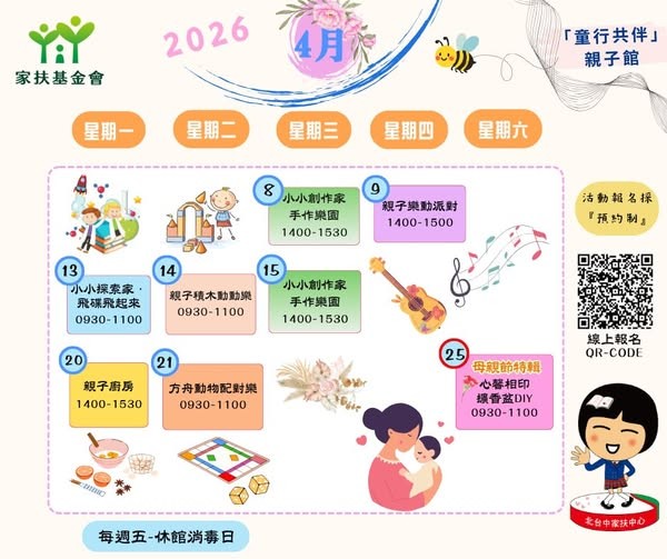 【童行共伴】親子館~2026 年 4 月份的課表來嘍!