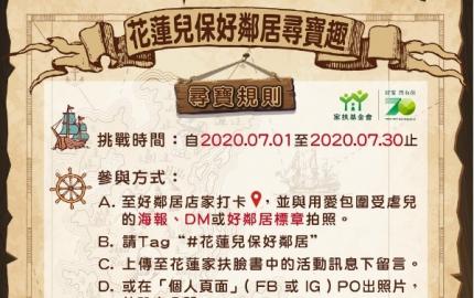 一、 尋寶規則 1. 挑戰時間:即日起至2020.07.30止 2. 參與方式: (1) 至「花蓮兒保好鄰居」店家打卡,並拍下 #用愛包圍受虐兒 的「海報」、「DM」或「好鄰居標章」其中一項即可。 (2) 請Ta...