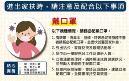 於疫情期間,在煩請進出家扶時,配合以下事項 1.量體溫 2.乾洗手