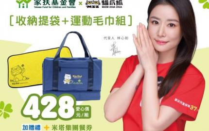 義賣品特色 「家扶x貓爪抓」收納提袋+運動毛巾組 裝衣鞋帶毛巾 旅遊健身出差 可套行李拉桿 運動毛巾百搭 每組加贈米塔集團套餐券
