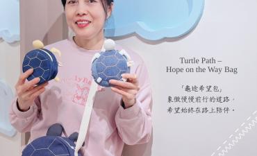 「龜途」象徵慢慢前行的道路, 「希望」始終在路上相伴🌻 站在攤位前的孩子說: 「如果海龜包能背在身上...