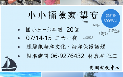 「望」之心「安」,傳承愛,你知道澎湖的八罩島在哪裡嗎? 那裡可是有澎湖著名的綠蠵龜產卵棲地保護區呢! 還能認識美麗的花宅聚落、探索海龜的秘密基地 讓家扶的哥哥姐姐,帶你們出企玩