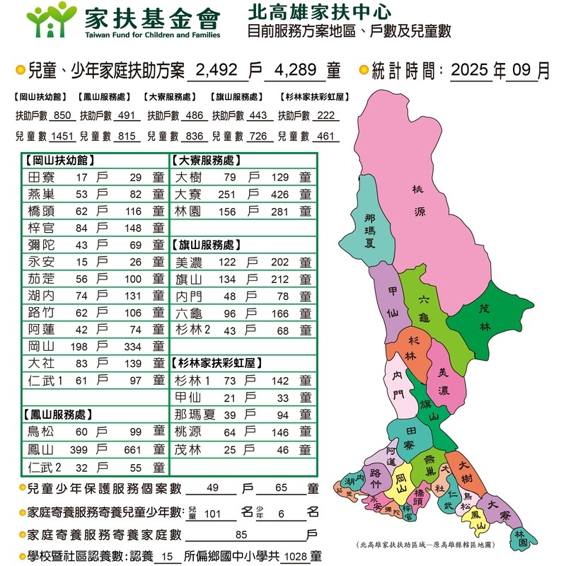 目前每月扶助北高雄地區弱勢兒童人數〈2025年09月30日〉:【兒童、少年扶助方案4,292名、兒童寄養服務101名、少年寄養服務6名、兒童少年保護服務65名、認養15所偏鄉國中小學共1028童、心理創傷復原服務、原住民鄉家庭服務】,38年來本中心已扶助14,000多名貧童長大自立,在社會各角落奉獻他們的心力。感謝政府及各界肯定與支持,讓我們能傾全力為弱勢兒童及其家庭提供完善的輔導與服務。