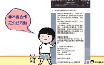 特此澄清:本會未與任何團體或個人合作招覽會員加入股市ATM之公益活動。民眾如對於公益活動有所疑慮時,可至家扶官方臉書留言,或撥打04-22061234洽詢。謝謝。