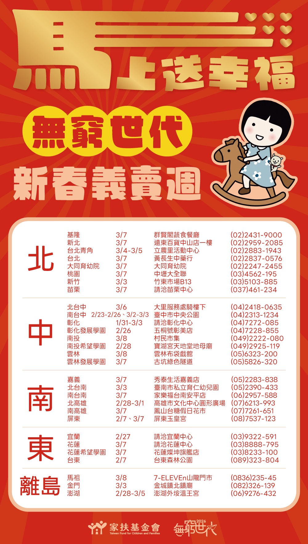 春寒料峭季節的基隆,正需要一份暖心的力量。幫助經濟弱勢家庭緩解生活重擔,並守護孩子們的心理健康;基隆家扶將於 115年3月7日(週六),假群賢閣蔬食餐廳舉辦「無窮世代義賣週」義賣活動。本次活動所得善款將全數投入「無窮世代」計畫,旨在為清寒學子籌措生活津貼與獎助學金,讓他們在風雨中也能擁抱一個「好好長大」的未來。