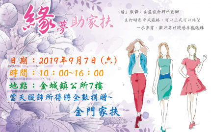 服裝設計師莊玉真將舉辦義賣活動,以自創的知名品牌服飾提供鄉親,將活動所得全數捐給金門家扶中心,做為家扶中心扶幼館的建館經費。此項「緣夢服飾」義助活動將於9月7日(六)早上十點到下午四...