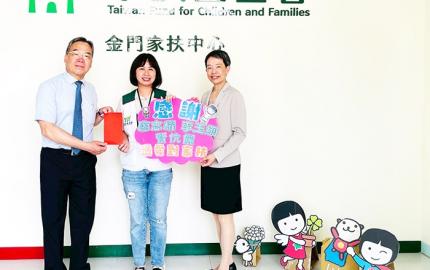 旅台鄉親廖志耀、李玉綢夫婦捐款新台幣20萬元,提供金門家扶中心扶幼助學服務,家扶中心主任洪依帆感謝廖志耀夫婦的愛心行動。