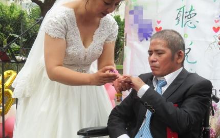 屏東家扶在大武公園為小芯爸媽舉辦圓夢婚禮,小芯今日是爸爸媽媽的花童,引領著穿著白紗的媽媽進到婚禮會場,親友、社工及志工39人齊聚祝福,並在扶幼主委林新安、前扶幼主委鄭碧玉見證下,交換...