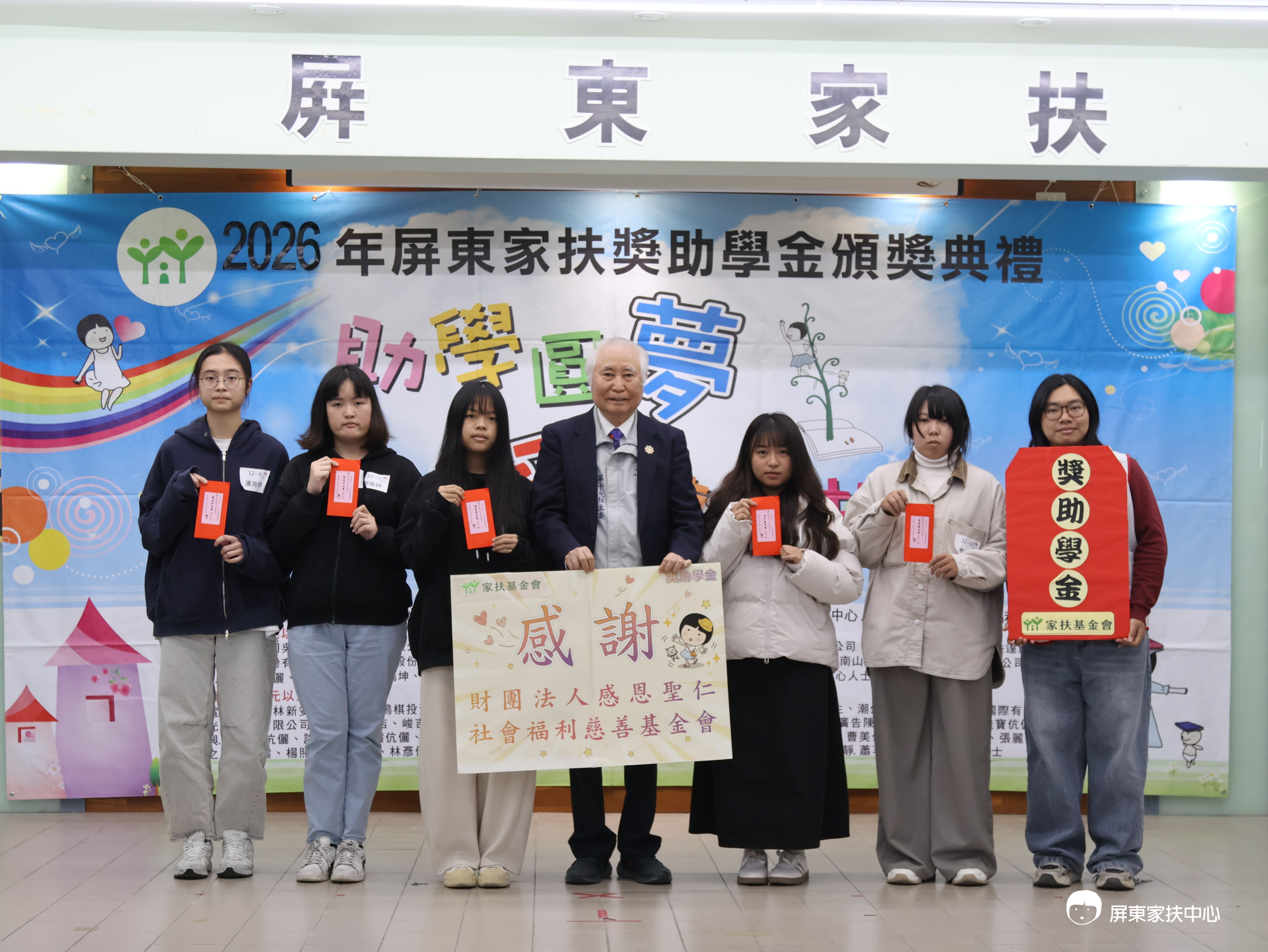 今天共有141名學業表現優異、學習態度積極的家扶大專生代表出席受獎,家扶期盼這份獎助學金能減輕家扶學子生活與學雜費的負擔,每一筆獎助學金,不只是經濟上的支持,更是一份肯定與鼓勵,為家扶學子注入前行的動力。此外,屏東家扶亦將陸續發放高中職、國中小學生獎助學金,預計共600名家扶學子受惠。家扶期盼透過長期的支持,陪伴兒少在人生不同階段成長,讓夢想在祝福中起飛、在感恩中延續,為社會培育更多具備責任與希望的新世代力量。