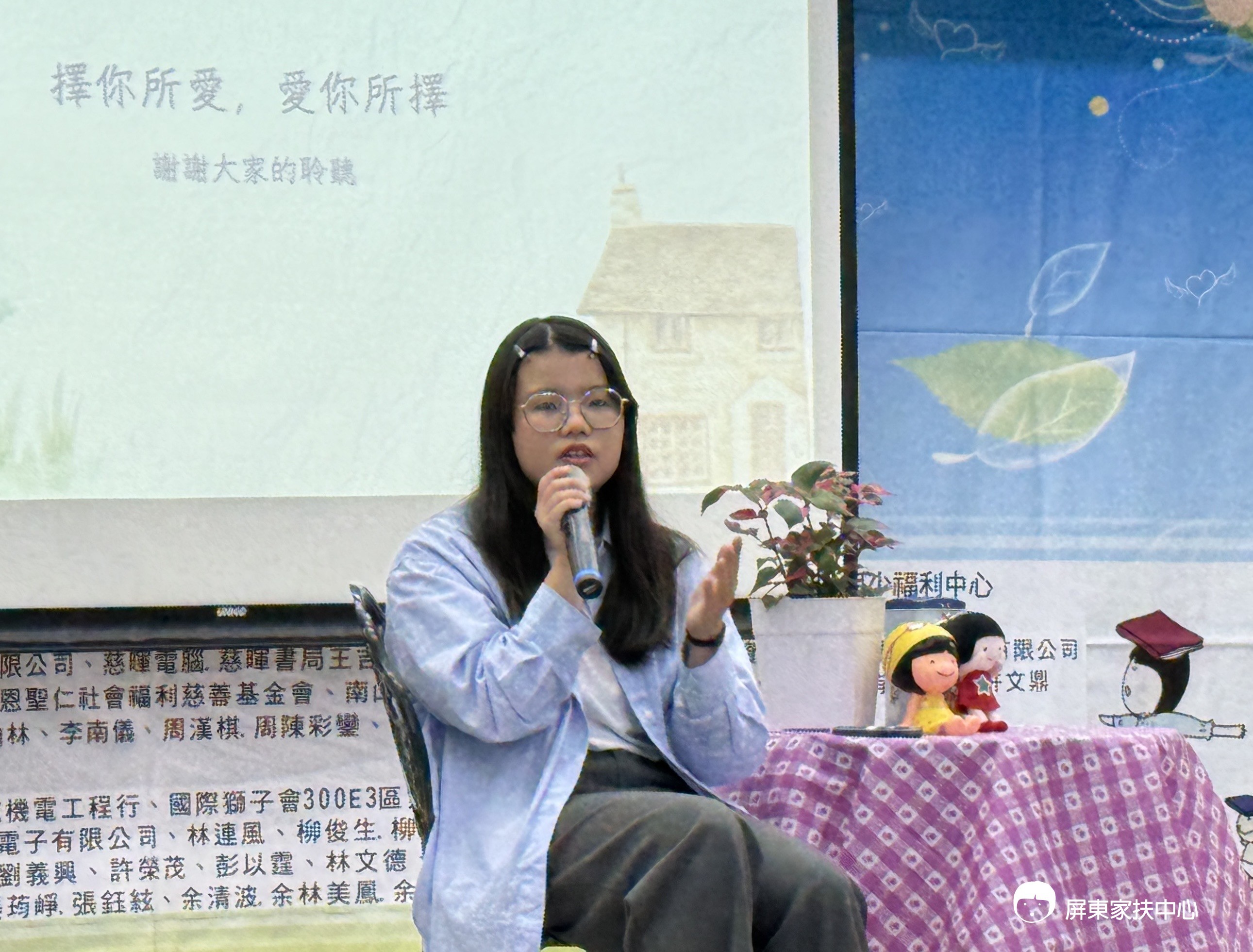 典禮尾聲,邀請家扶自立青年-蔡秀英小姐,她分享與家扶的緣分始於莫拉克風災,當時接受經濟與物資扶助的她,在家扶陪伴中逐漸萌生「有朝一日,也要把這份愛傳下去。」於是秀英從受助者走向付出者,積極投入志工服務,並透過「家扶釣竿方案」前進偏鄉,去年更跟隨家扶前進柬埔寨擔任國際志工,將心中溫暖的愛遠渡重洋到更需要的國家。