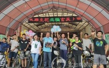 家扶青少年艷陽天下騎單車苦行學做公益 不簡單 起程前齊聚新營真武殿 獲贈「騎」福手套壯遊平安行