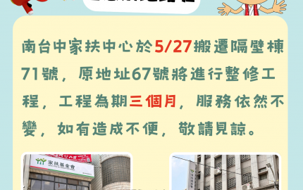 南台中家扶今年在地服務已經60年,館舍也因長年的使用下出現許多結構上裂痕、壁癌,為了提供更好活動空間及設備的淘汰換新,原地址67號(A棟)將進行館舍修繕,我們將「暫時」搬遷至隔壁71號(B棟)...