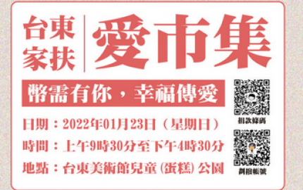台東家扶中心將於111年01月23日在台東美術館兒童公園(蛋糕公園) 辦理「家扶‧愛市集~幣需有你,幸福傳愛」貧困家庭學童助學活動~