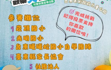 台東家扶中心在4月25日(星期六)於台東美術館兒童公園舉辦「身體小衛兵‧歡樂大冒險」兒童保護宣導活動,,透過闖關遊戲、宣導攤位及親子互動等方式推動兒少保護工作,邀請民眾一同響應兒童保護...