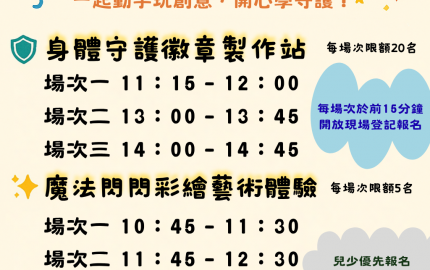 4月25日準備好和孩子一起展開任務了嗎? 🎉 身體守護徽章─ 製作屬於自己的小衛兵徽長 🎉 魔法閃閃的彩繪藝術─ 小朋友最愛的身體彩繪✨ 🎉 神盾防衛隊:彩色基地─ 畫出屬於自己的守護之盾
