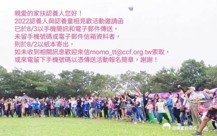 2022認養人與認養童相見歡活動邀請函已於8/3以手機簡訊和電子郵件傳送,未留手機號碼或電子郵件信箱資料者,則於8/2以紙本寄出,如未收到相關訊息歡迎來信momo_tt@ccf.org.tw索取,或來電留下手...