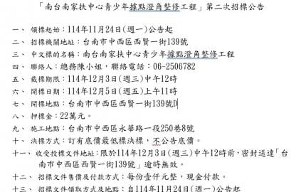「南台南家扶中心青少年據點澄角整修工程」第二次招標公告