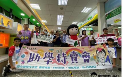 本中心於8月4日上午十點在台南郵局儲匯股一樓大廳舉辦助學特賣開幕記者會,現場有多家愛心商品廠商代表及郵局人員參與,而兩天特賣會收入,將全數作為家扶兒的助學金