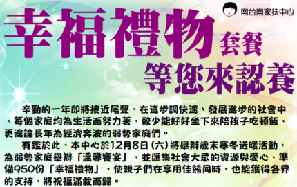 💖 辛勤的一年即將接近尾聲,在這步調快速、發展進步的社會中,每個家庭均為生活而努力著,較少能好好坐下來陪孩子吃頓飯,更遑論長年為經濟奔波的弱勢家庭們。 💖 有鑑於此,本中心於12月8日(...