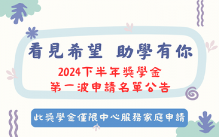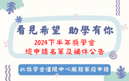 以下為本次的『線上』申請名單(非獲獎名單),若有提交線上申請但不在名單者,則需提供申請表回覆證明(到自己的信箱查看)。 若有成績單不完整、志工服務時數未完成登錄等需補件的同學,請於8/...