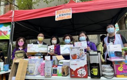 雲林家扶莪馨會賴文玉隊長帶著志工伙伴們高聲吶喊:果菜汁機、清淨機、料理鍋、豆漿機、烤箱還有日韓生活用品任您選購!為家扶無窮義賣每個莪馨會媽媽無不使盡全力,義賣助學讓家扶兒安心上學。