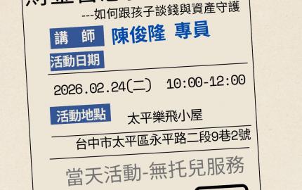 🔰二月講座日期/主題:02/24(二)10:00-12:00/財金智慧教育與信託---如何跟孩子談錢與資產 🔰三月講座日期/主題:03/05(四)10:00-12:00/把時間還給孩子-拒絕被3C收編的大腦,重建思考與耐心。