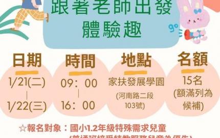 老師們預計規畫戶外體驗行程,帶著孩子們一起走出戶外體驗趣。歡迎國小一二年級就讀普通班之特生報名參與唷!