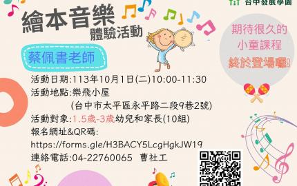 🔸課程日期:10/1(二)10:00-11:30 🔸活動地點:樂飛小屋(台中市太平區永平路二段9巷2號) 🔸活動對象:1.5-3歲親子(10組)