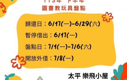 太平樂飛小屋 暫停借出:6/17(一) 盤點日:7/1(一)~7/6(六) 開放外借:7/8(一)