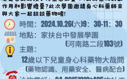 學園特地邀請身心科診所藥師來與家長們談一談,希望可以協助家長們更了解身心科常見用於12歲以下兒童的藥物,及用藥安全與如何在用藥過程中與醫生配合。