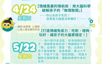 🔹講座日期/主題:4/24(四)10:00-12:00/情緒風暴的導航術 🔹講座日期/主題:5/22(四)10:00-12:00/打造情緒免疫力