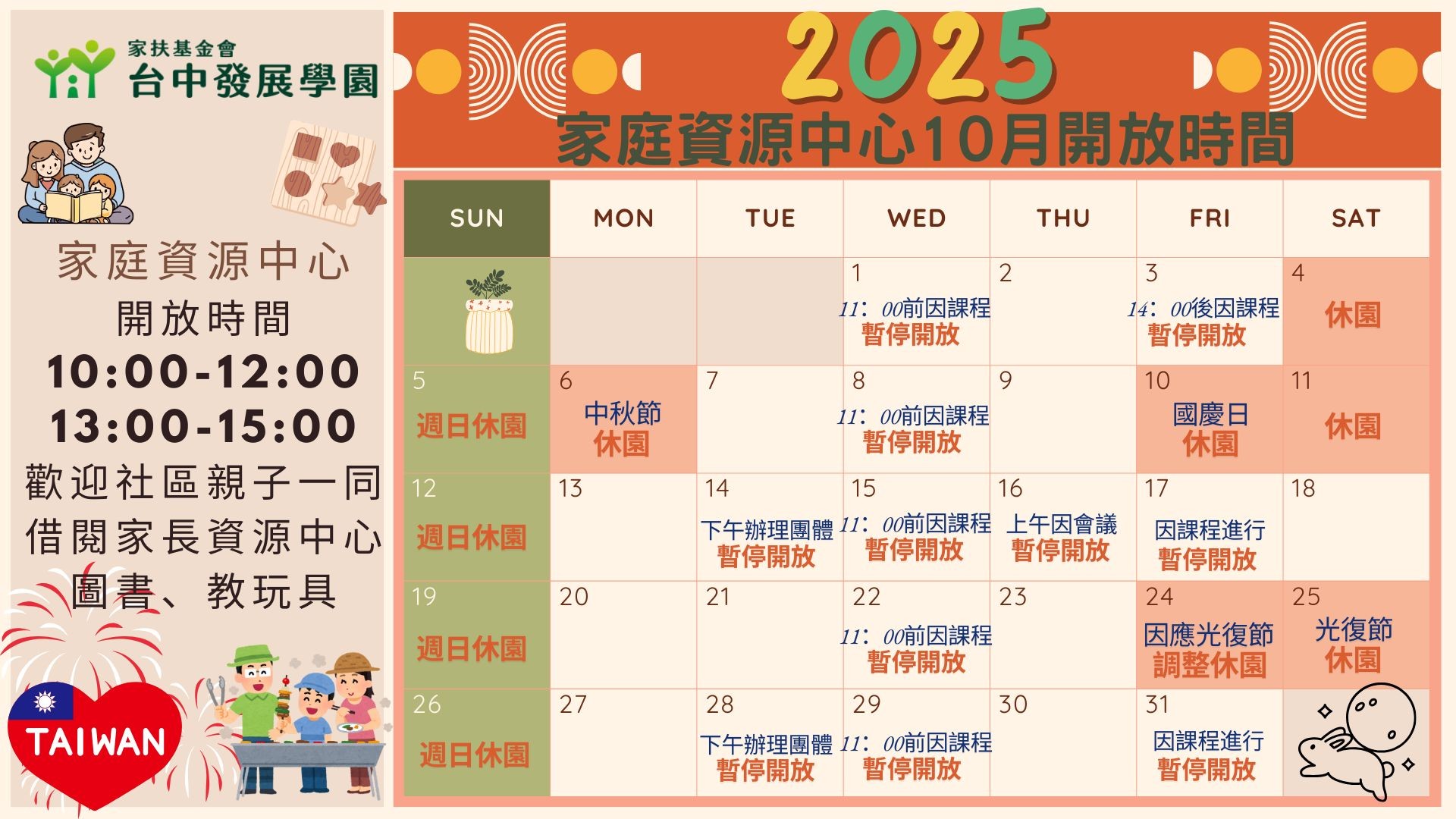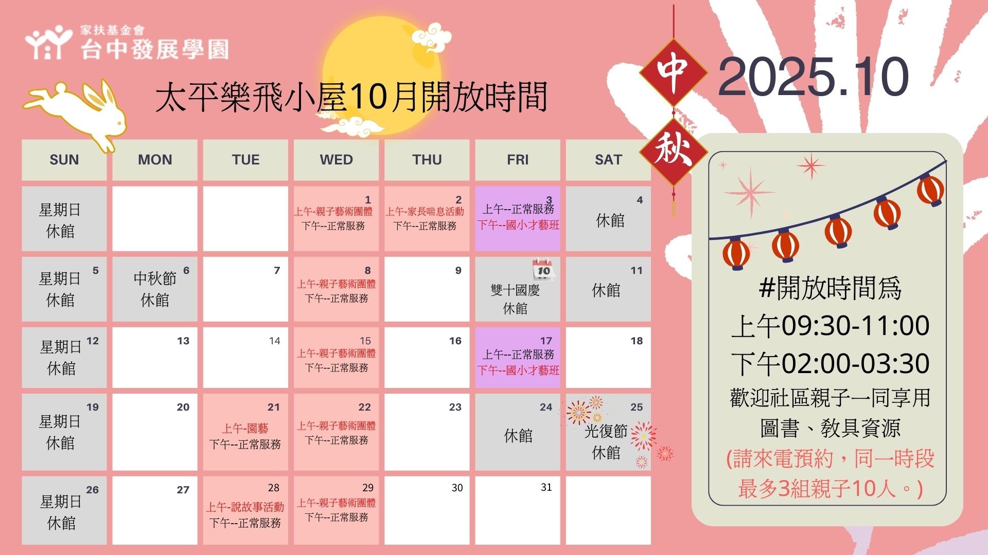<2025年10月份家庭資源中心、太平樂飛小屋開放公告>