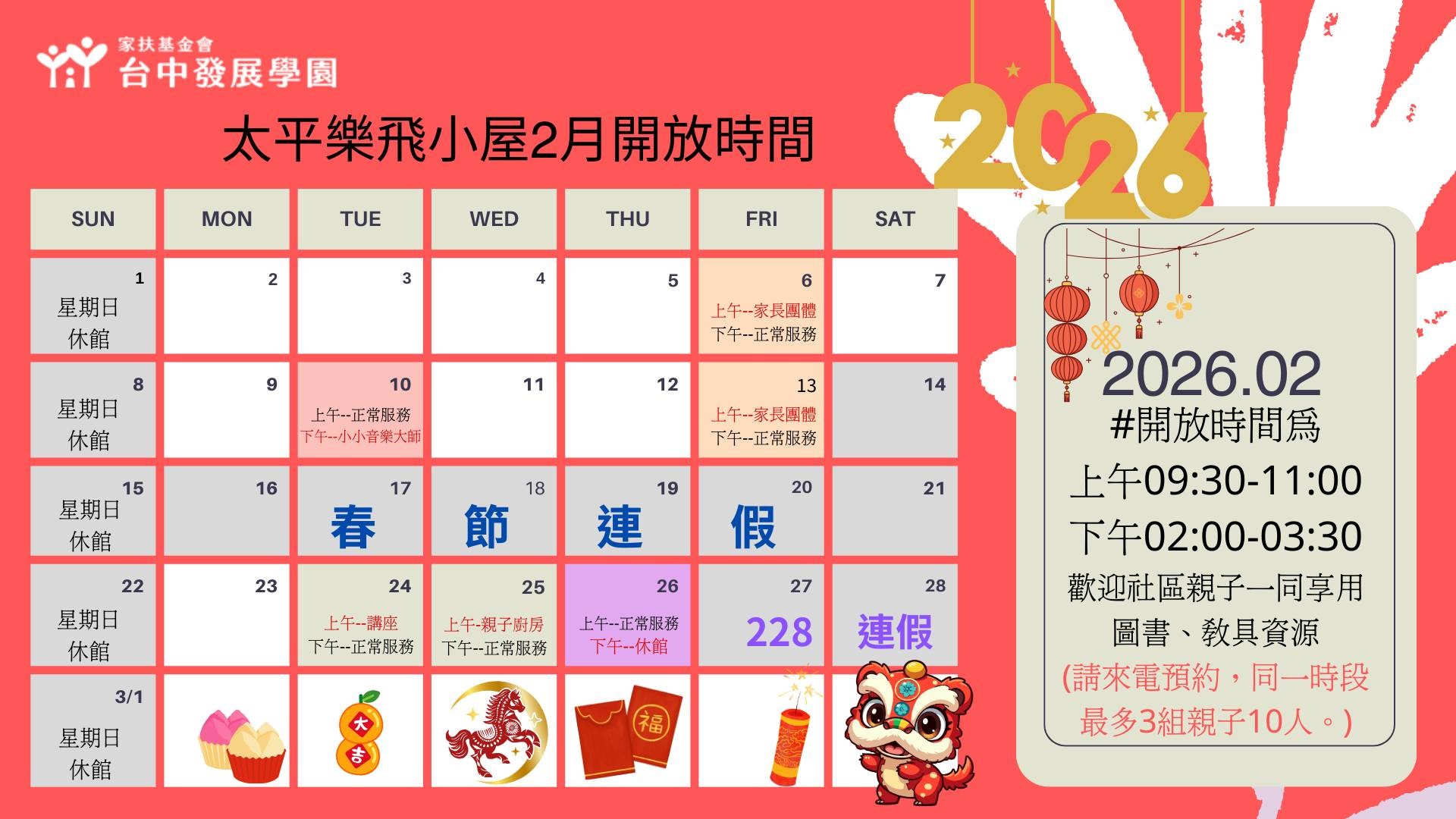 <2026年2月份家庭資源中心、太平樂飛小屋開放公告>