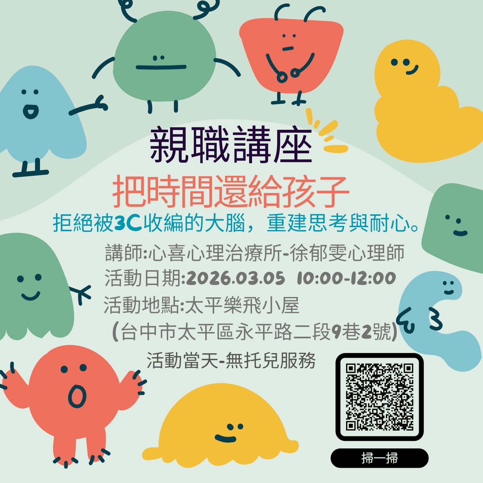 🔰三月講座日期/主題:03/05(四)10:00-12:00/把時間還給孩子-拒絕被3C收編的大腦,重建思考與耐心。