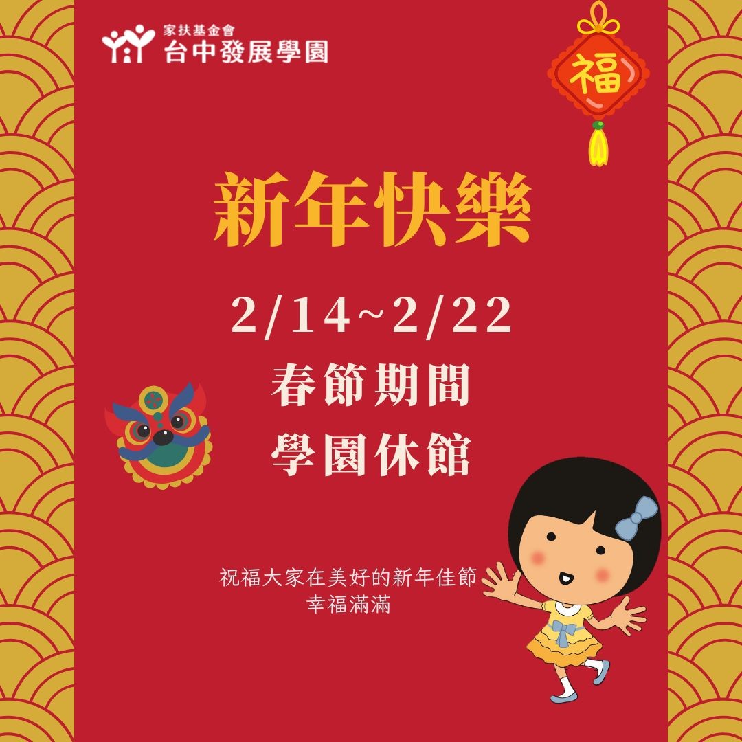 感謝您長期以來對台中發展學園慢飛兒童的關懷與支持,適逢農曆春節假期,學園將於📅 2月14日(星期六)至2月22日(星期日)休園9天。