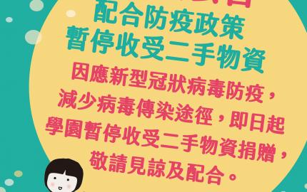 感謝許多關心及幫助學園的您,一直以來送來暖暖的物資,暖暖的用在妹妹的身上及也暖暖的在心裡。 但因應新型冠狀病毒防疫,減少病毒傳染途徑,即日起學園暫停收受二手物資捐贈,敬請見諒及配...