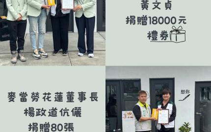 在這個充滿愛與希望的季節,我們衷心感謝張美慧議員媒合這次活動。 在此,我們要特別感謝NET黃文貞董事長,捐贈價值18,000元的禮券,以及麥當勞花蓮董事長楊政道伉儷,捐贈80張麥當勞點心卡兌...