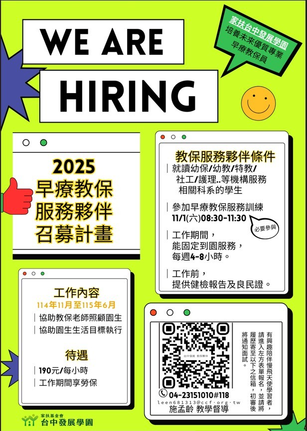 家扶台中發展學園早療教保夥服務2025重新招募開跑囉!